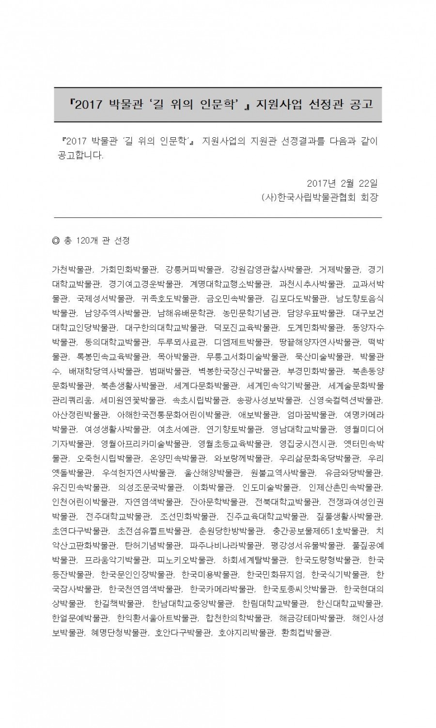 2017 박물관 길 위의 인문학 지원사업 선정관 발표 페이지 정보 작성자 관리자 작성일17-02-22 20:00 조회42,429회 댓글0건 관련링크 이전글 다음글 목록 본문 댓글목록 등록된 댓글이 없습니다. 이전글 다음글 목록