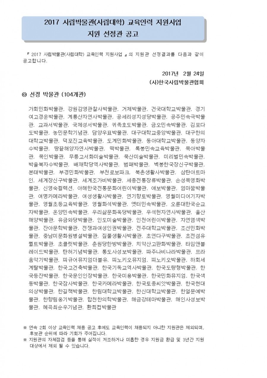 2017 사립박물관(사립대학) 교육인력 지원사업 지원 선정관 공고 페이지 정보 작성자 관리자 작성일17-02-24 19:58 조회42,054회 댓글0건 관련링크 이전글 다음글 목록 본문 댓글목록 등록된 댓글이 없습니다. 이전글 다음글 목록