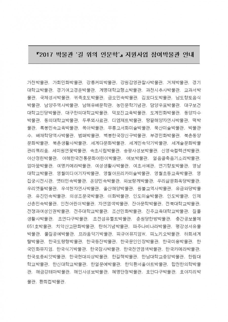 2017 박물관 길 위의 인문학 지원사업 참여박물관 페이지 정보 작성자 관리자 작성일17-03-07 09:18 조회42,168회 댓글0건 관련링크 이전글 다음글 목록 본문 2017 박물관 길 위의 인문학 지원사업 참여박물관 댓글목록 등록된 댓글이 없습니다. 이전글 다음글 목록