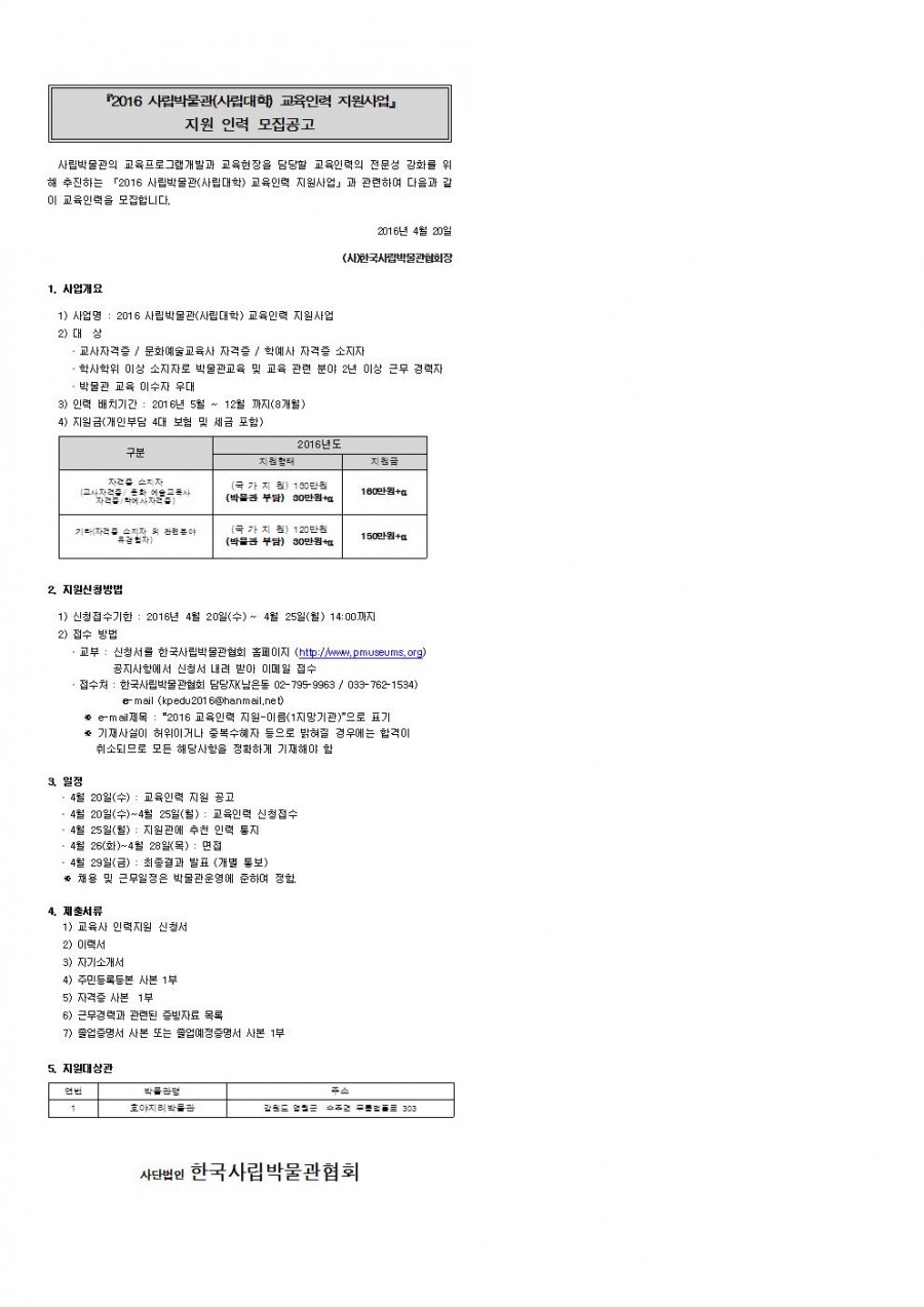 2016 사립박물관(사립대학) 교육인력 지원사업 지원인력 모집 공고(호야지리박물관)