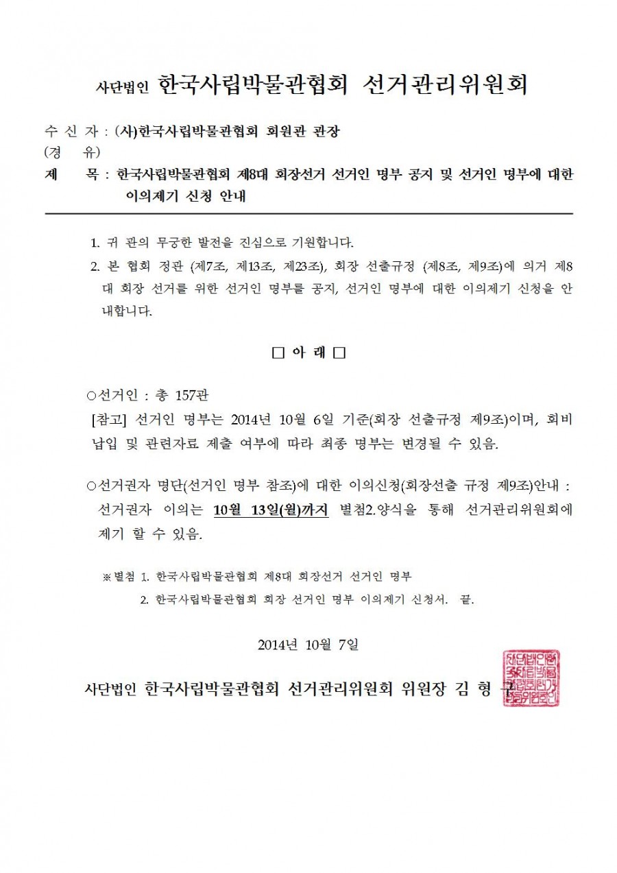 제8대 회장선거 선거인 명부 공지 및 선거인 명부에 대한 이의제기 신청 안내