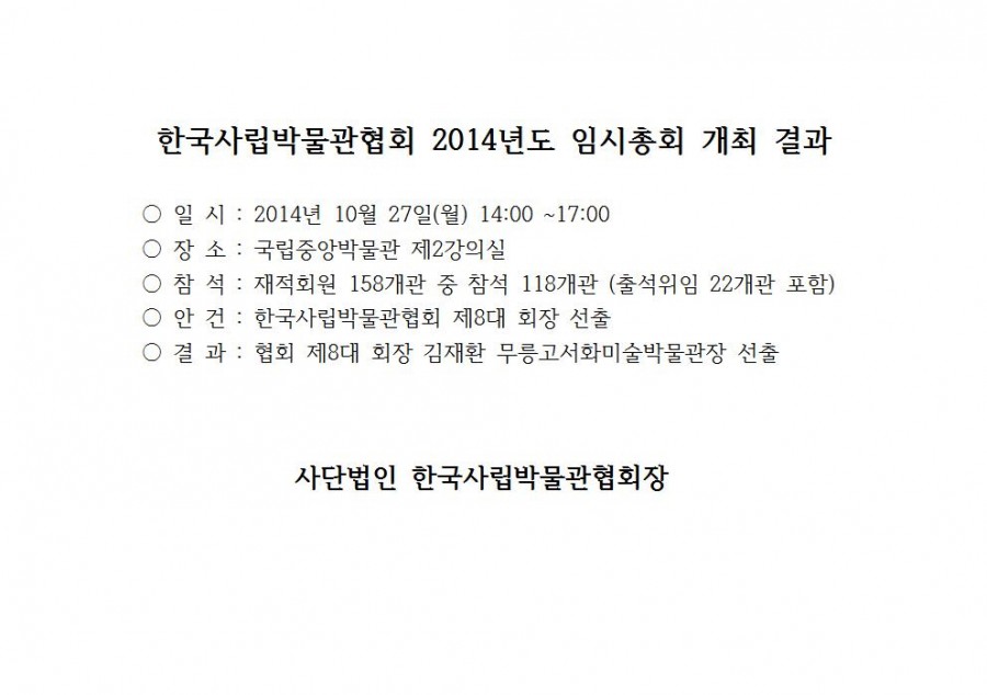 한국사립박물관협회 2014년도 임시총회 개최 결과 페이지 정보 작성자 관리자 작성일14-10-28 14:42 조회42,107회 댓글0건 관련링크 이전글 다음글 목록 본문 댓글목록 등록된 댓글이 없습니다. 이전글 다음글 목록
