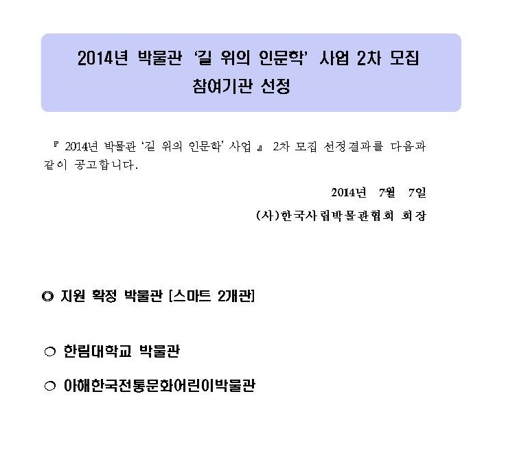 [인문학] 2014 박물관 길 위의 인문학 2차 기관모집 선정결과발표 페이지 정보 작성자 관리자 작성일14-07-07 14:30 조회40,091회 댓글0건 관련링크 이전글 다음글 목록 본문 댓글목록 등록된 댓글이 없습니다. 이전글 다음글 목록