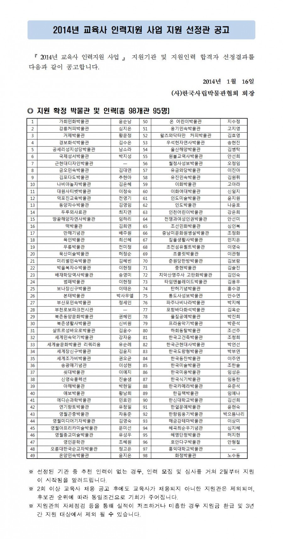 『 2014년 교육사 인력 지원사업 』 지원기관 선정 공고 페이지 정보 작성자 관리자 작성일14-01-16 14:05 조회37,812회 댓글0건 관련링크 이전글 다음글 목록 본문 댓글목록 등록된 댓글이 없습니다. 이전글 다음글 목록