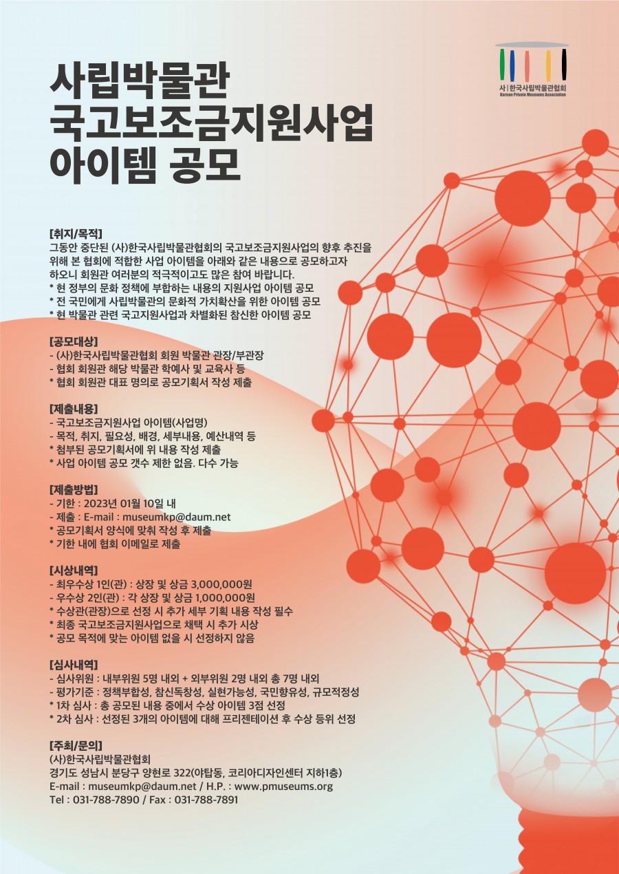 현재 진행하고자하는 '사립박물관 국고보조금지원사업 아이템 공모사업'도 그 일환으로 진행하려고 하는 사업으로서 여러분들의 지혜와 아이디어가 반드시 함께 해야 하는 사업입니다.