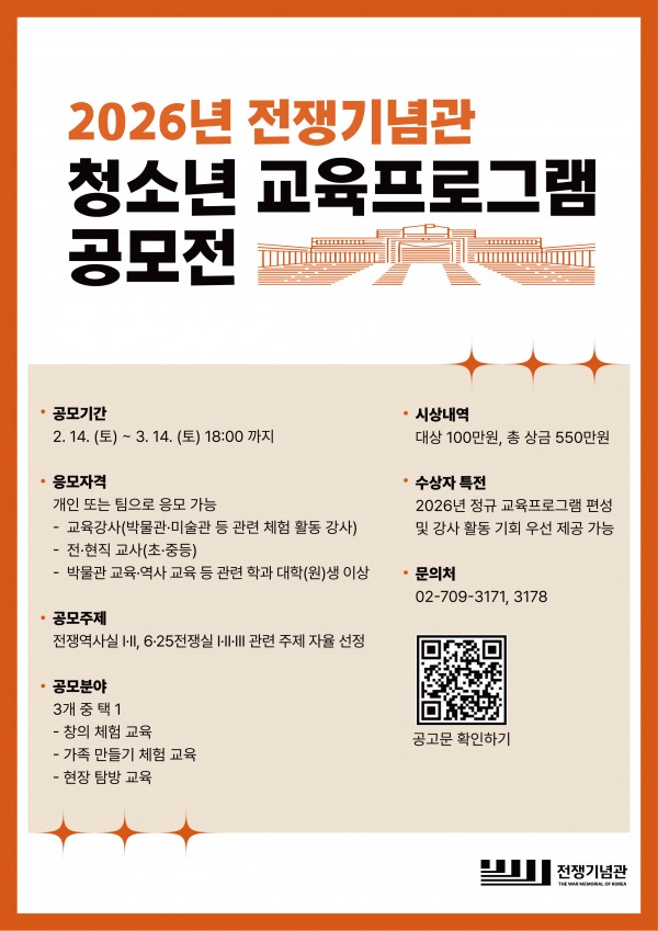 - 공모명: 2026년 전쟁기념관 청소년 교육프로그램 공모